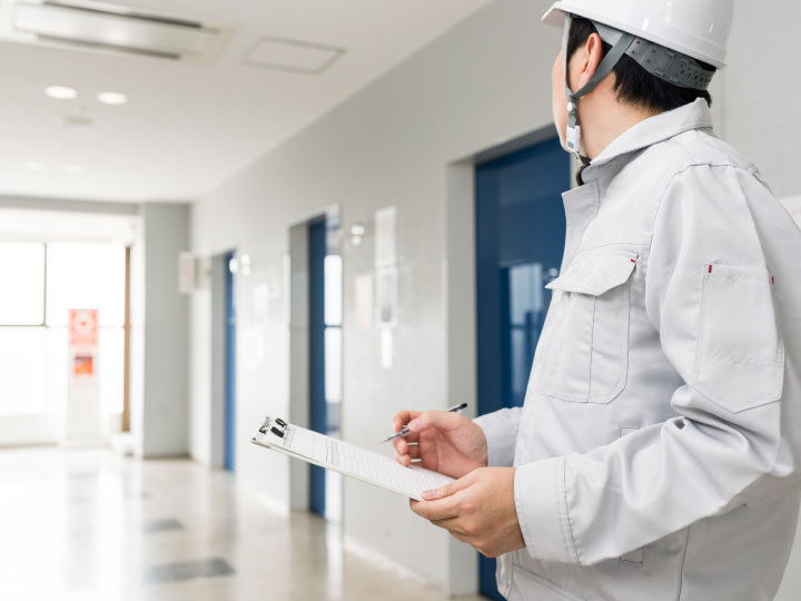 敷地及び地盤 に問題がないか、建築物の外部や屋上・屋根に劣化や損傷がないか、防火区画や避難施設の状況調査等を行ないます。